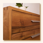 Die hohen Räume werden mit der „Hausbibliothek“ optimal genutzt: Viel Platz für Bücher oben, Stauraum durch Schubladen und Schiebetüren unten. Die Ablagefläche ist beim Sortieren der Bücher sehr nützlich. CD’s und DVD’s finden ihren Platz in den Schubladen, Schiebetüren geben den unteren Stauraum frei ohne dabei in den Raum zu stehen. Weitere interessante Details: durchgehende gestemmte Zapfen an den Seiten, die lebhafte Struktur über die gesamte Front hinweg durchlaufend. Ausgeführt in Kernbuche geölt.