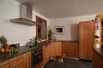 Der Kundenwunsch hier war es, einen guten Platz für eine Kaffeemaschine zu schaffen - Kochen und Geniessen standen zunächst nicht so sehr im Zentrum der Überlegungen. Gemeinsam mit dem Kunden entwickelte sich die Idee einer Wohnküche mit Bar. Details wie offene Fächer am Ende der Küchenzeile für Kochbücher und anderes Schöne, ein offenes Weinregal geben dieser Küche die besondere Note.